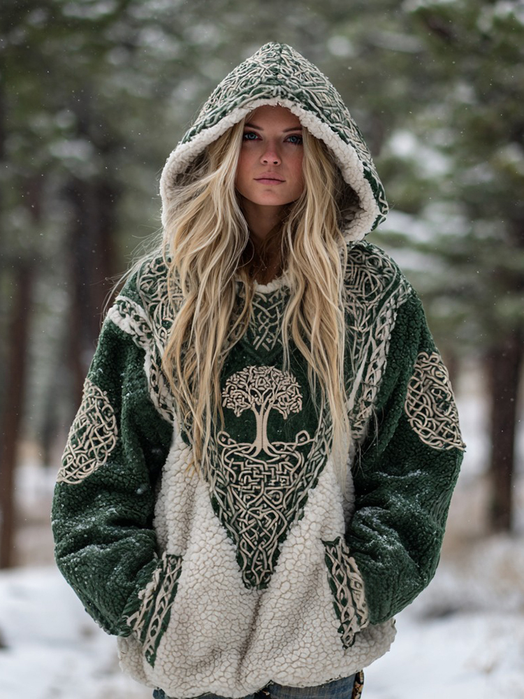 Women's Vintage Tree Of Life Celtic Contrast Color Design Plush Warm Hoodie