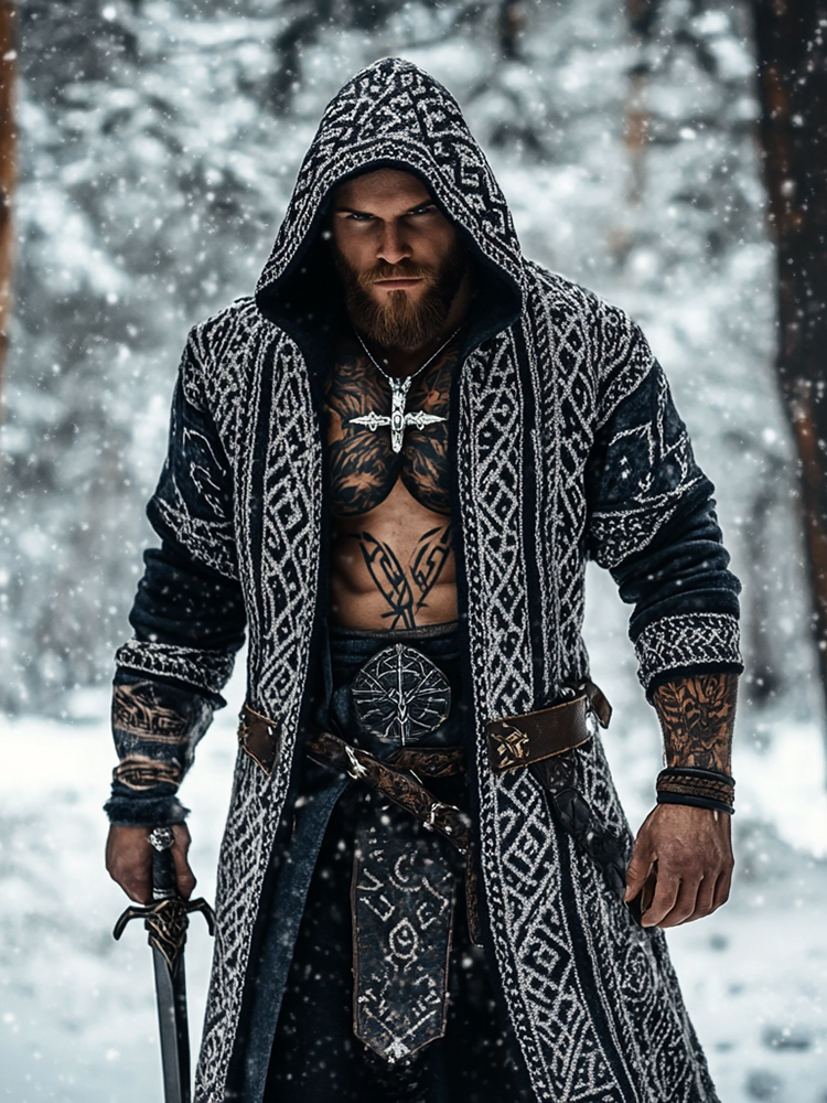 Men's Viking Celtic Geometry Pattern Art Knitted Hooded Cardigan