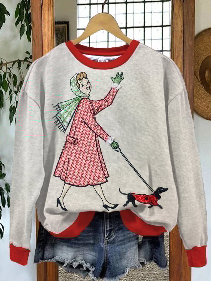 Women's Vintage Girl and Dachshund Print Sweatshirt