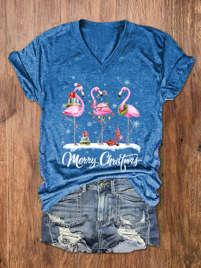 Women's Merry Christmas Flamingo Print T-Shirt