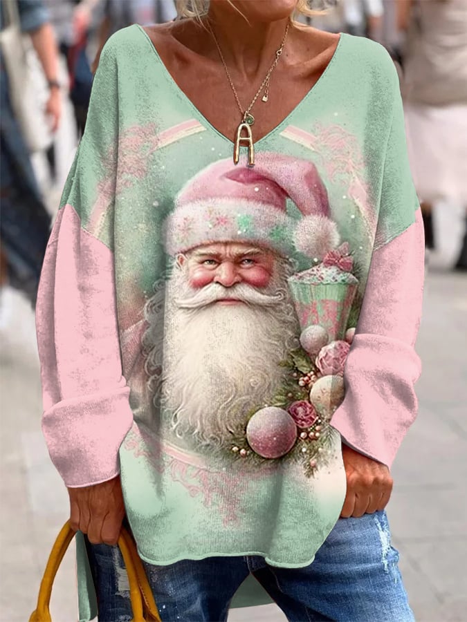 Women's Retro Santa Claus Print Christmas Casual V-Neck Top