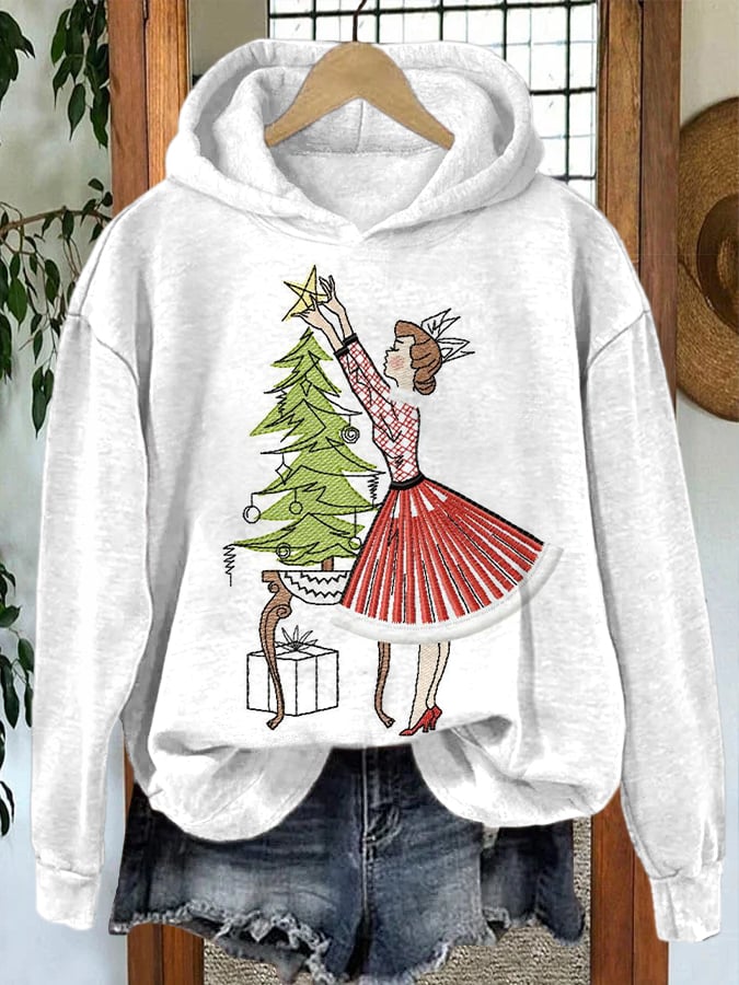 Women's Retro Girl and Christmas Tree Hoodie