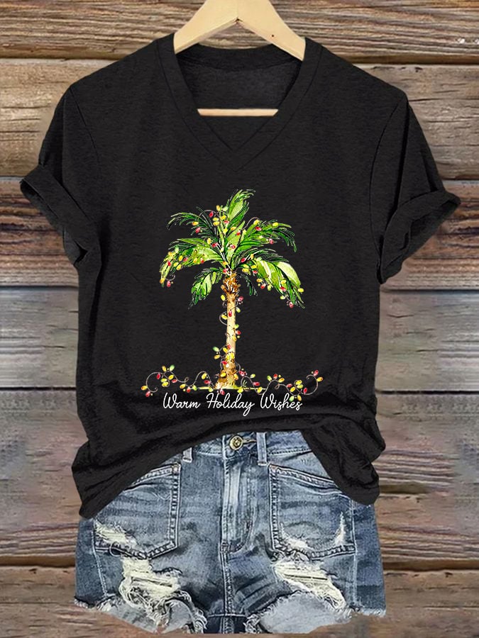Women's Christmas Palm Tree Print V-Neck Casual T-Shirt