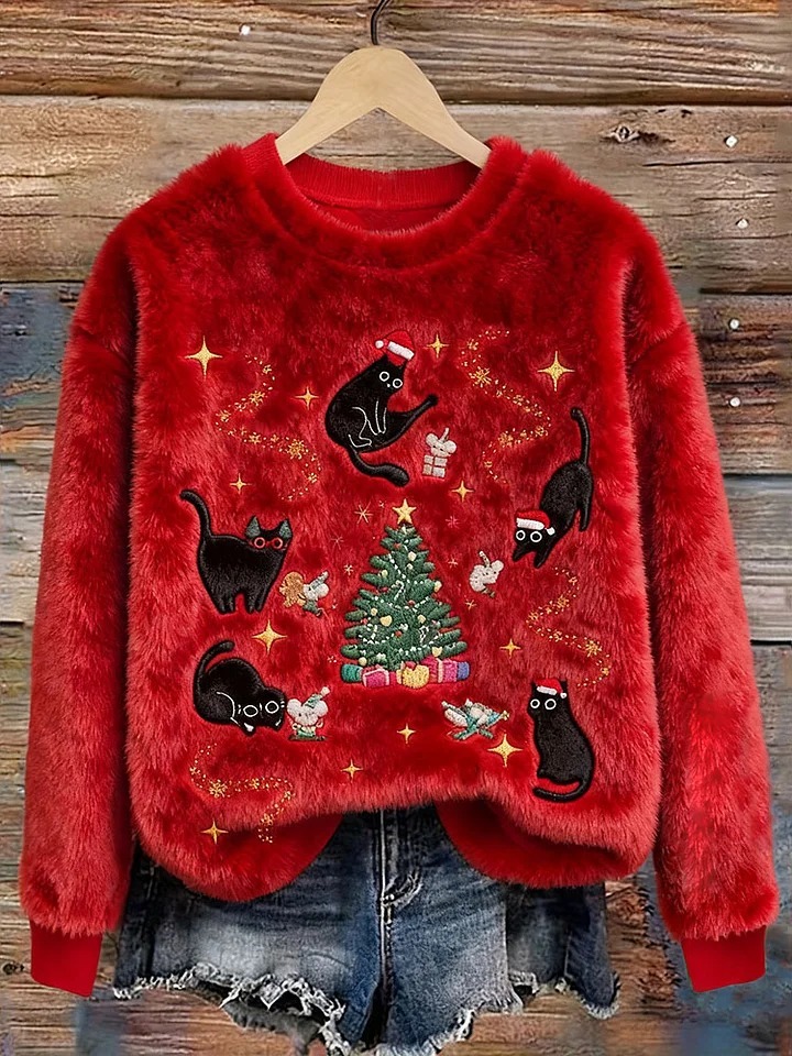 Christmas Cat Art Casual Cotton Plush Sweatshirt