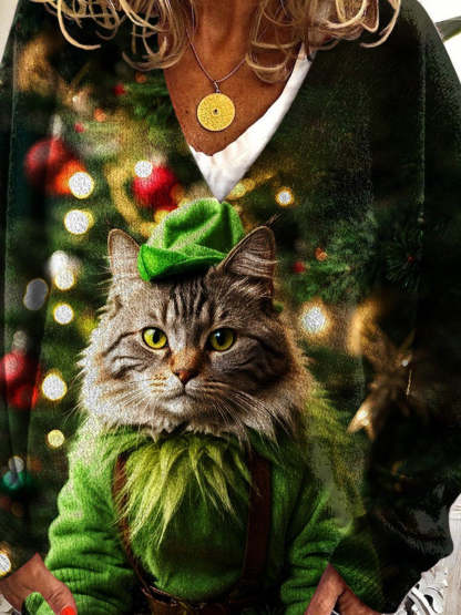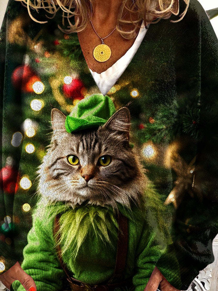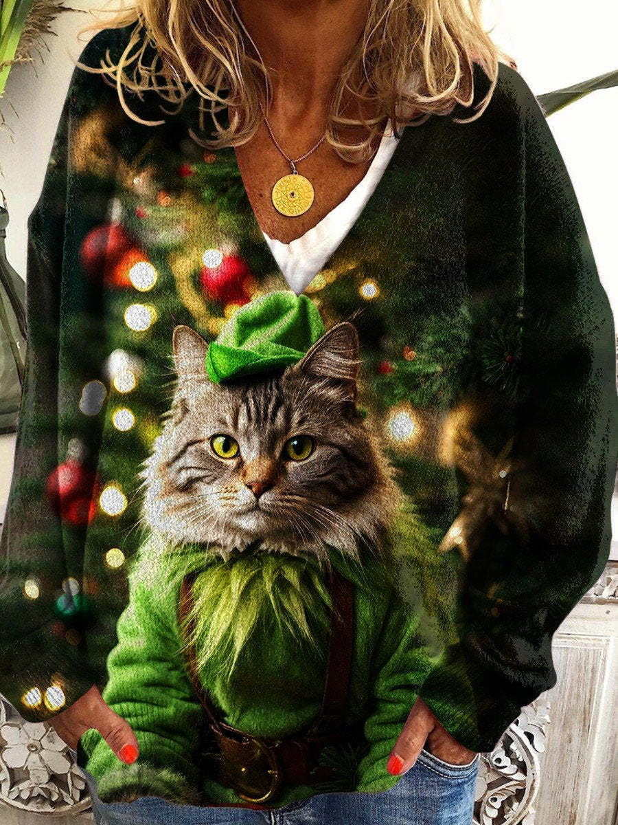 Christmas Cat Print V-neck Casual Sweater