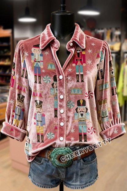 Christmas Nutcracker Print Print Collared Velvet Top
