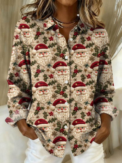 Christmas Santa Art Print Casual Cotton Shirt