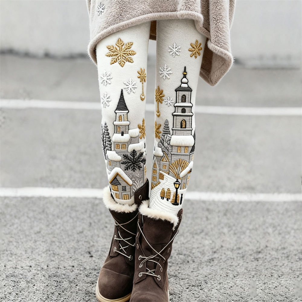 Christmas Snow Scene Embroidered Women's Knit Leggings