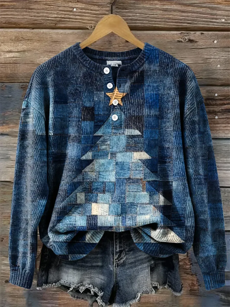 Christmas Tree Patchwork Art Print Buttoned Cardigan Sweater