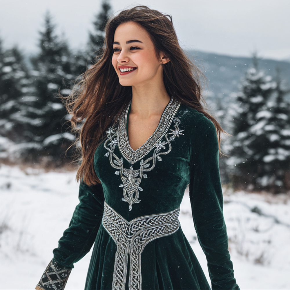 Christmas Vintage Rhinestone Viking Pattern Women's V-neck Flannel Maxi Dress