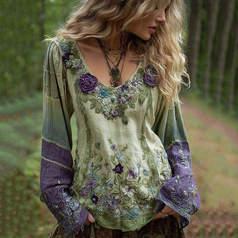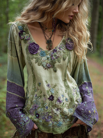 Classy Gradient Purple Lavender And Floral Embroidered Linen Long Sleeve Shirt