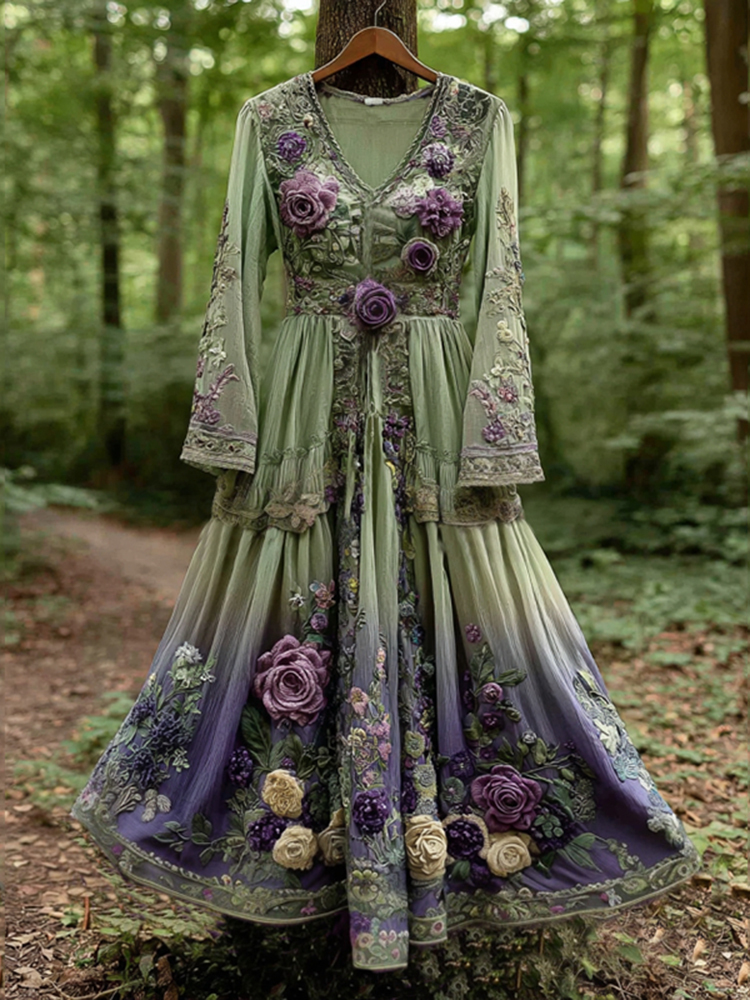 Classy Gradient Purple Lavender And Floral Embroidered Linen Maxi Dress
