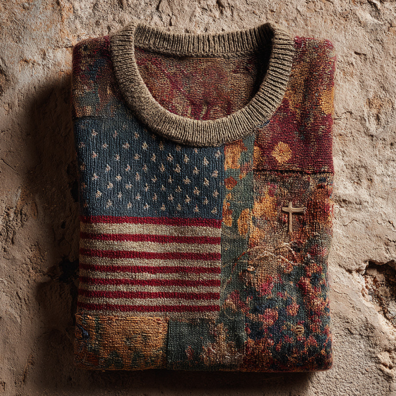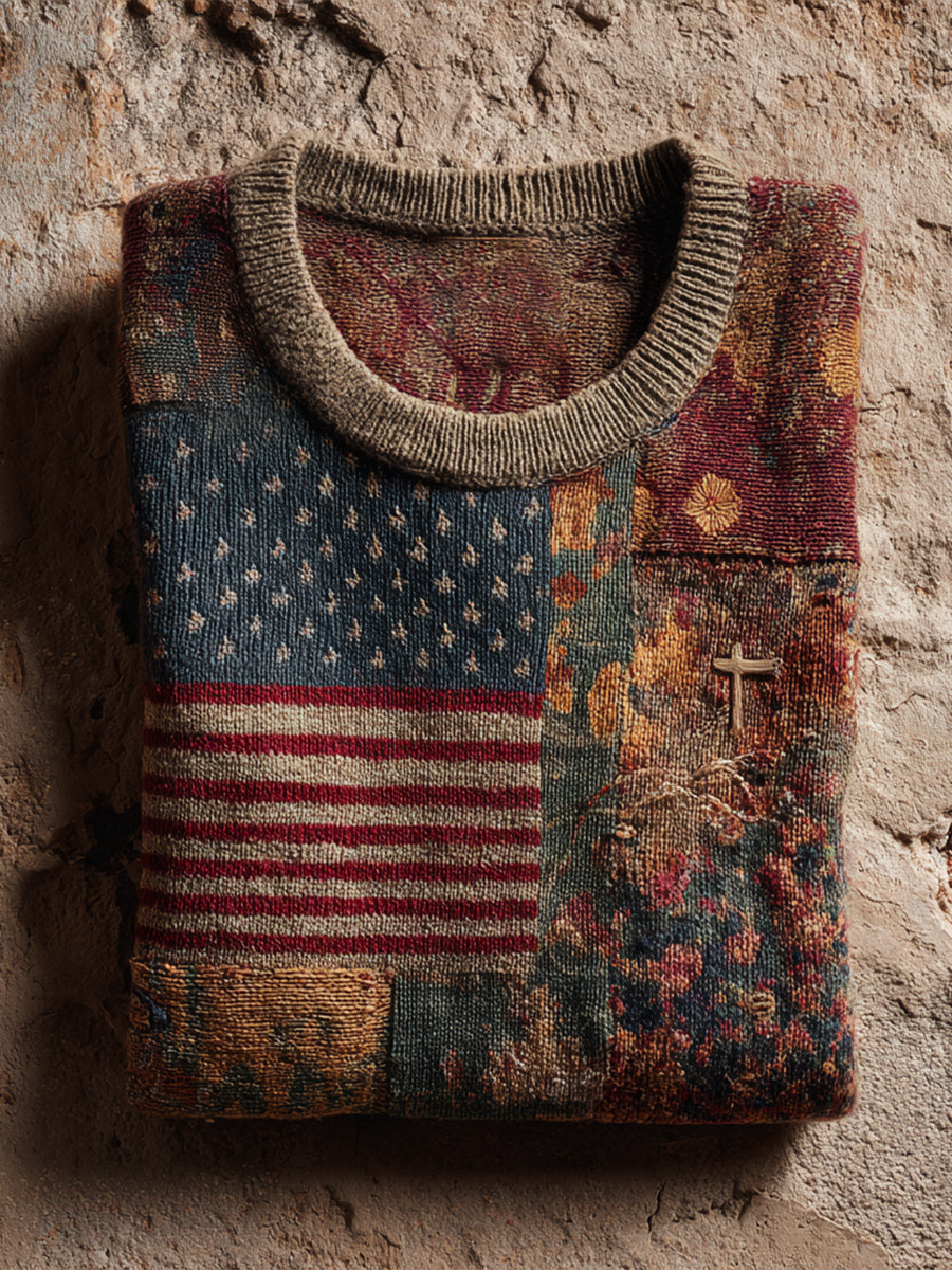 Faith Vintage American Flag Patchwork Art Print Casual Knit Sweater