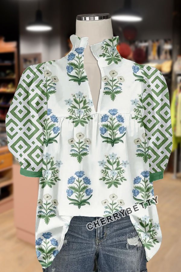 Floral Print V-Neck Geo Puff Sleeve Top