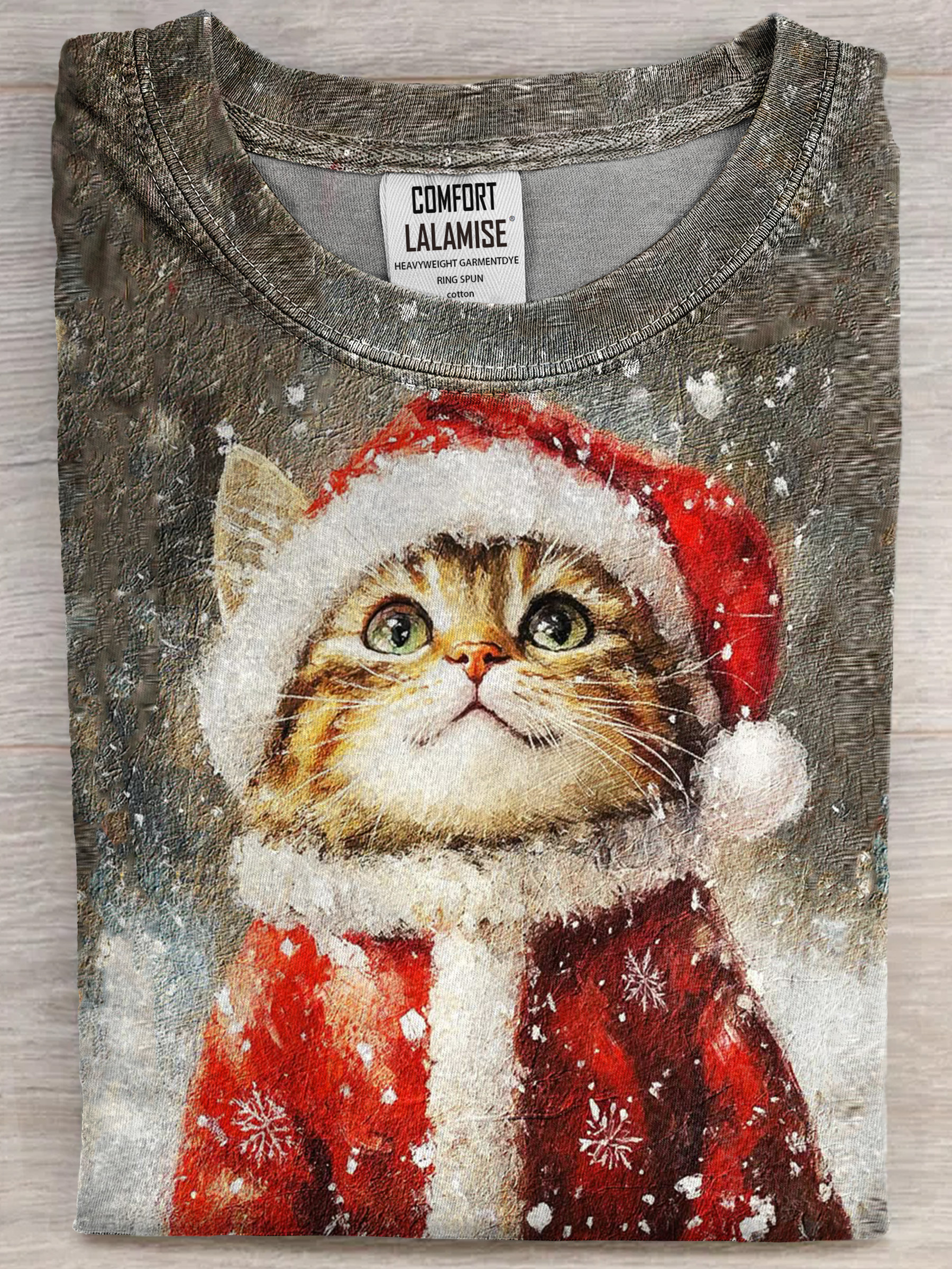 Funny Christmas Cat Art Print Cotton Casual Short Sleeve T-shirt