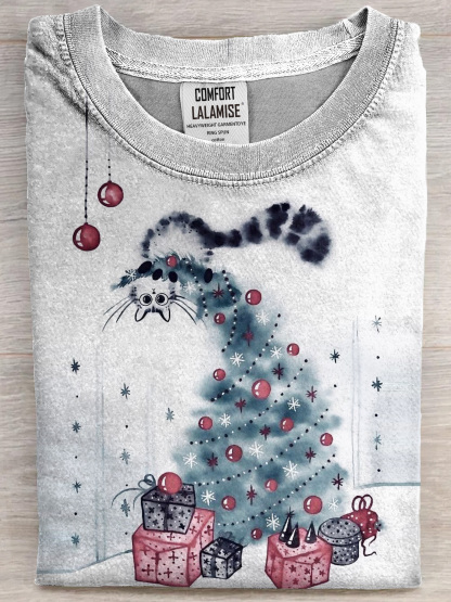 Funny Christmas Tree Cat Art Print Cotton Casual Short Sleeve T-shirt