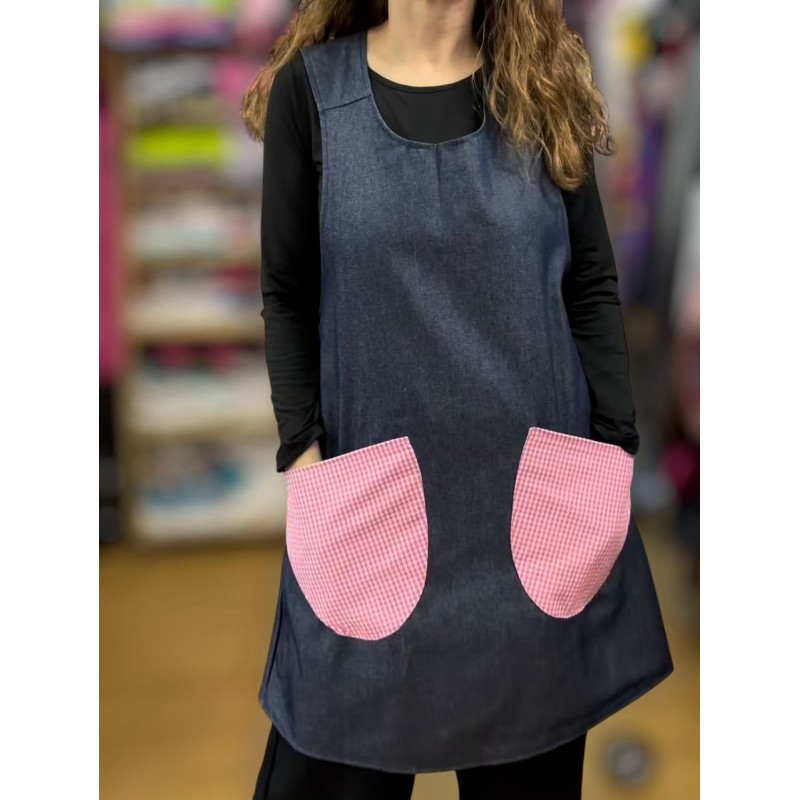 Gray Denim Pink Checkered Patchwork Cross Strap Apron