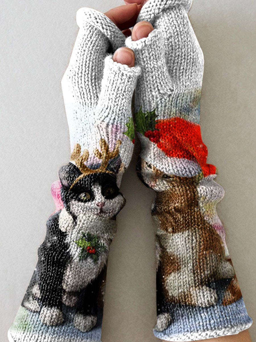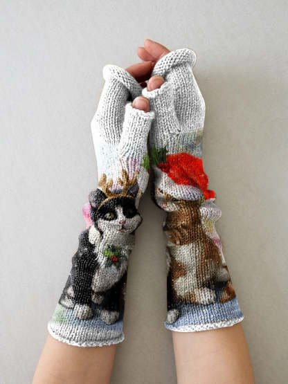 Knit Cute Christmas Hat Antlers Cat Hug Snow Printing Fingerless Gloves