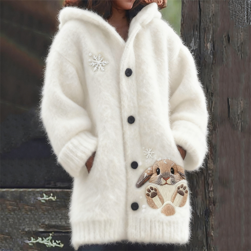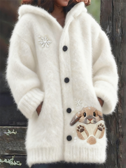 Lovely Bunny & Snow Embroidered Cozy Knit Hooded Cardigan