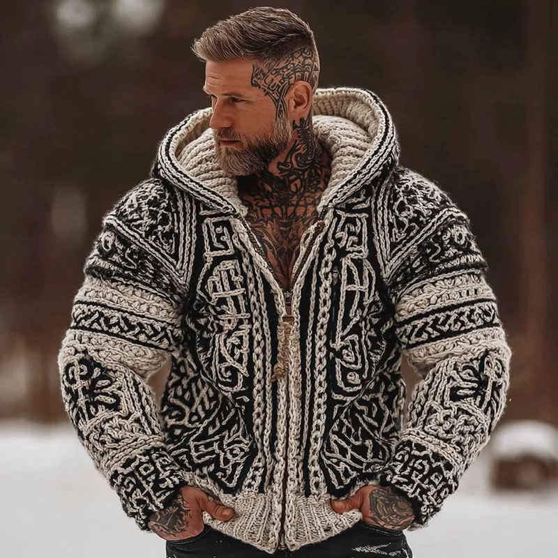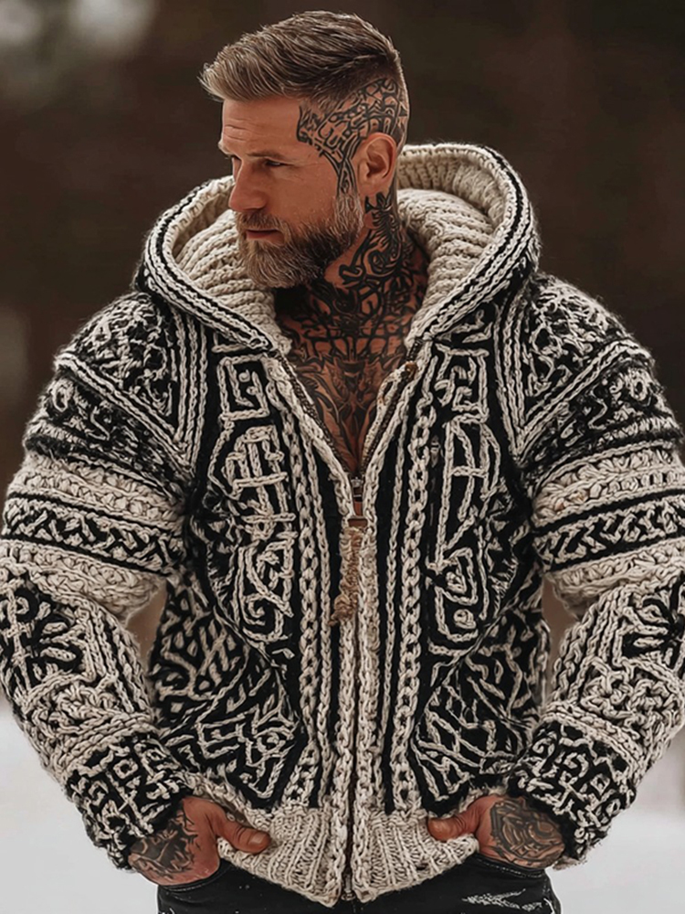 Men's Celtic Knot Chunky Knit Warm Zip-up Hooded Sweater