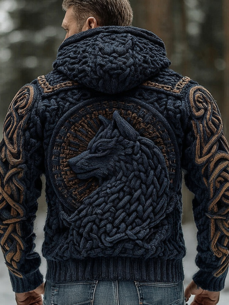 Men's Viking Wolf Totem Chunky Knit Hooded Cardigan