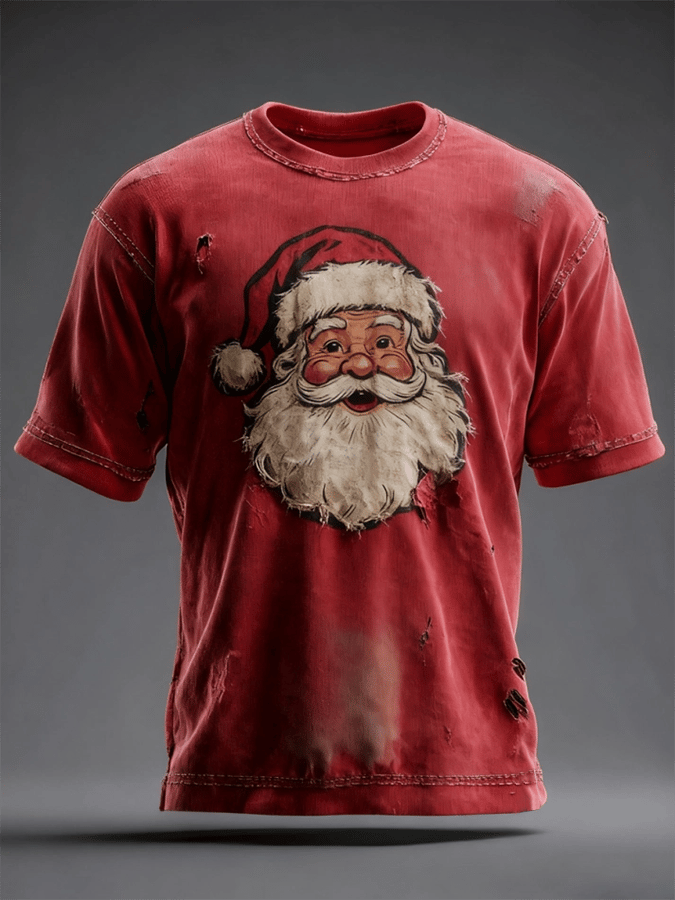 Men's Vintage Distressed Santa Claus Print Casual T-Shirt