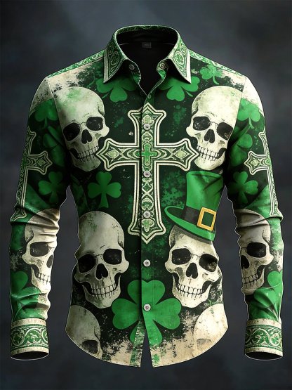 Men's vintage St. Patrick's Day skull pattern long-sleeved shirt