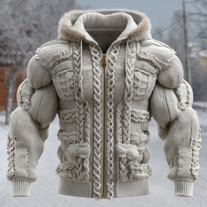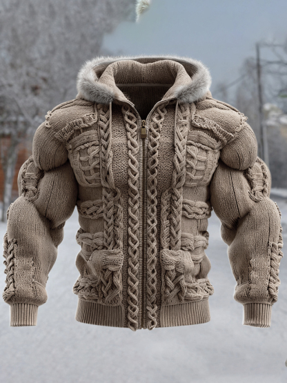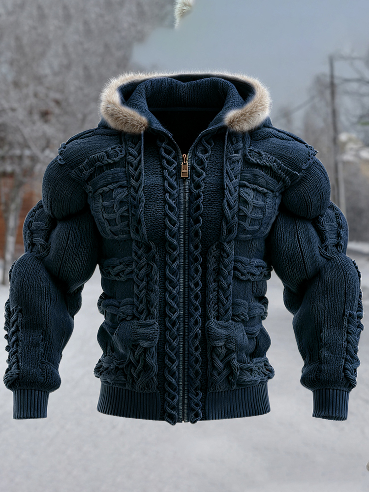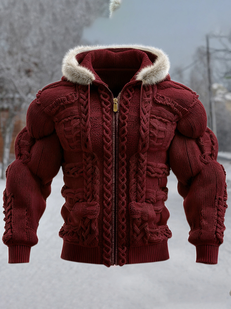 Men's Vintage Viking Christmas Knitted Fur Collar Hooded Sweater