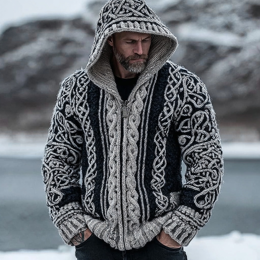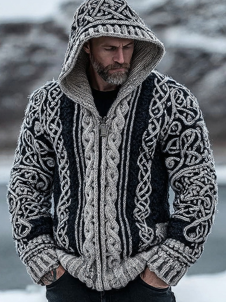 Men'svintage Viking Celtic Contrast Zip Up Hooded Cardigan