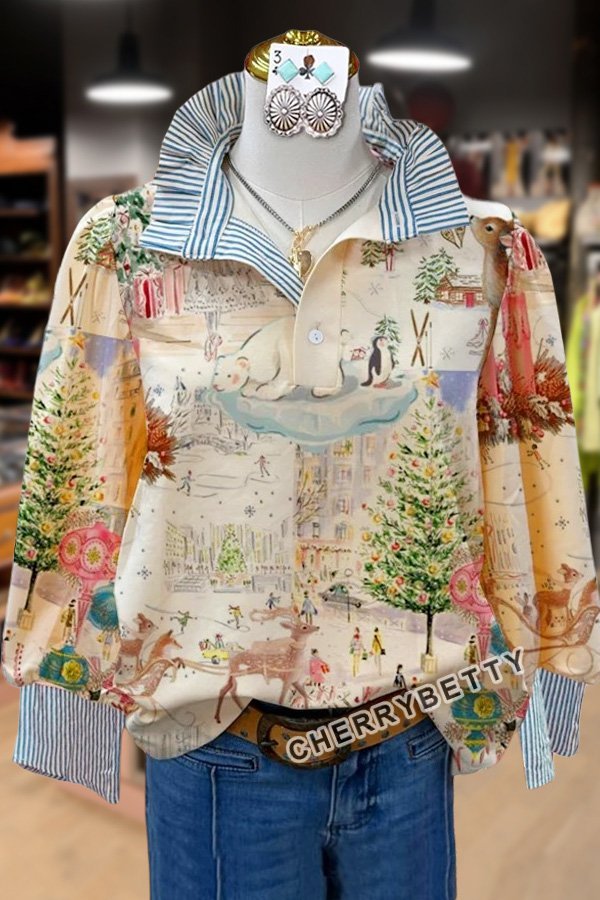 Mixed Christmas Print Striped Collar Top