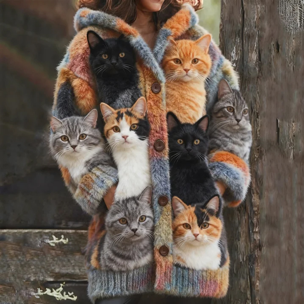 Probe Cat Fleece Hooded Cardigan Long Sweater