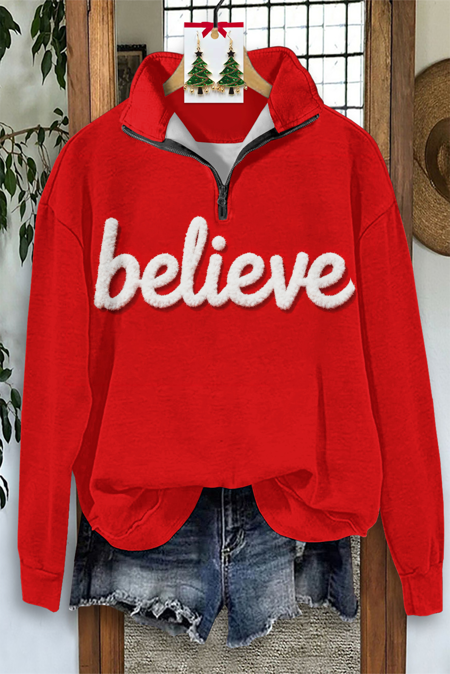 Classic Christmas Believe Print Zip-Up Sweatshirt