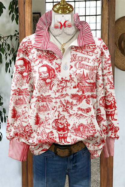 Classic Christmas Santa Claus Stripe Print Stand Collar Blouse
