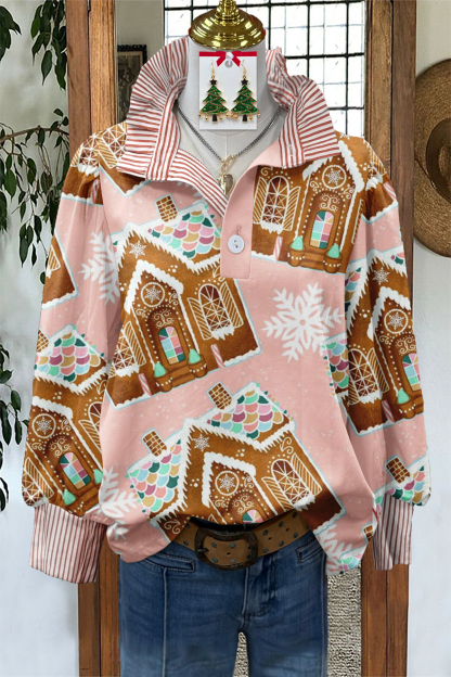Sweet Christmas Gingerbread House Print Stand Collar Blouse