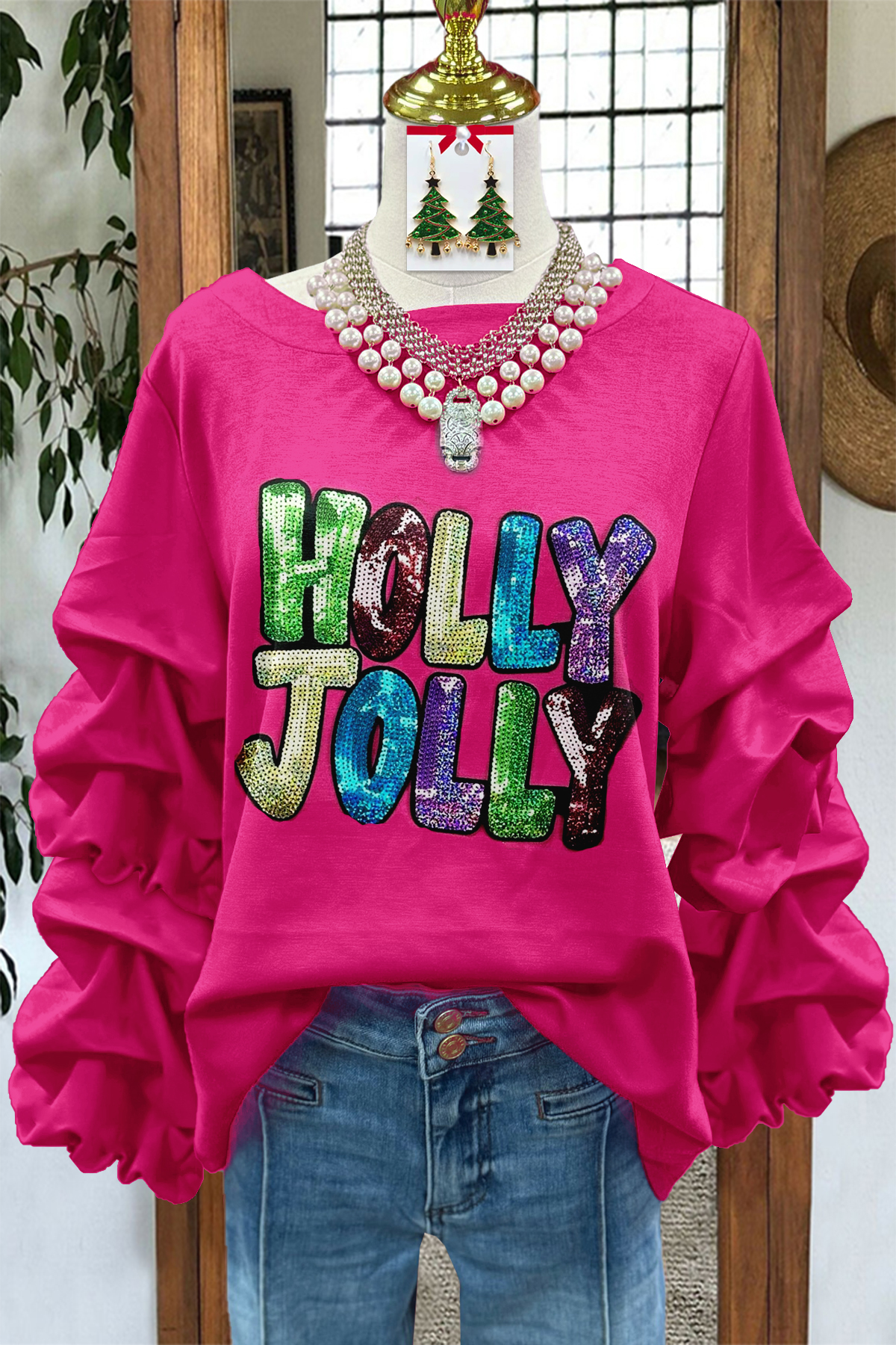 Cute Holly Jolly Sequin Print Pleated Sweatshirt