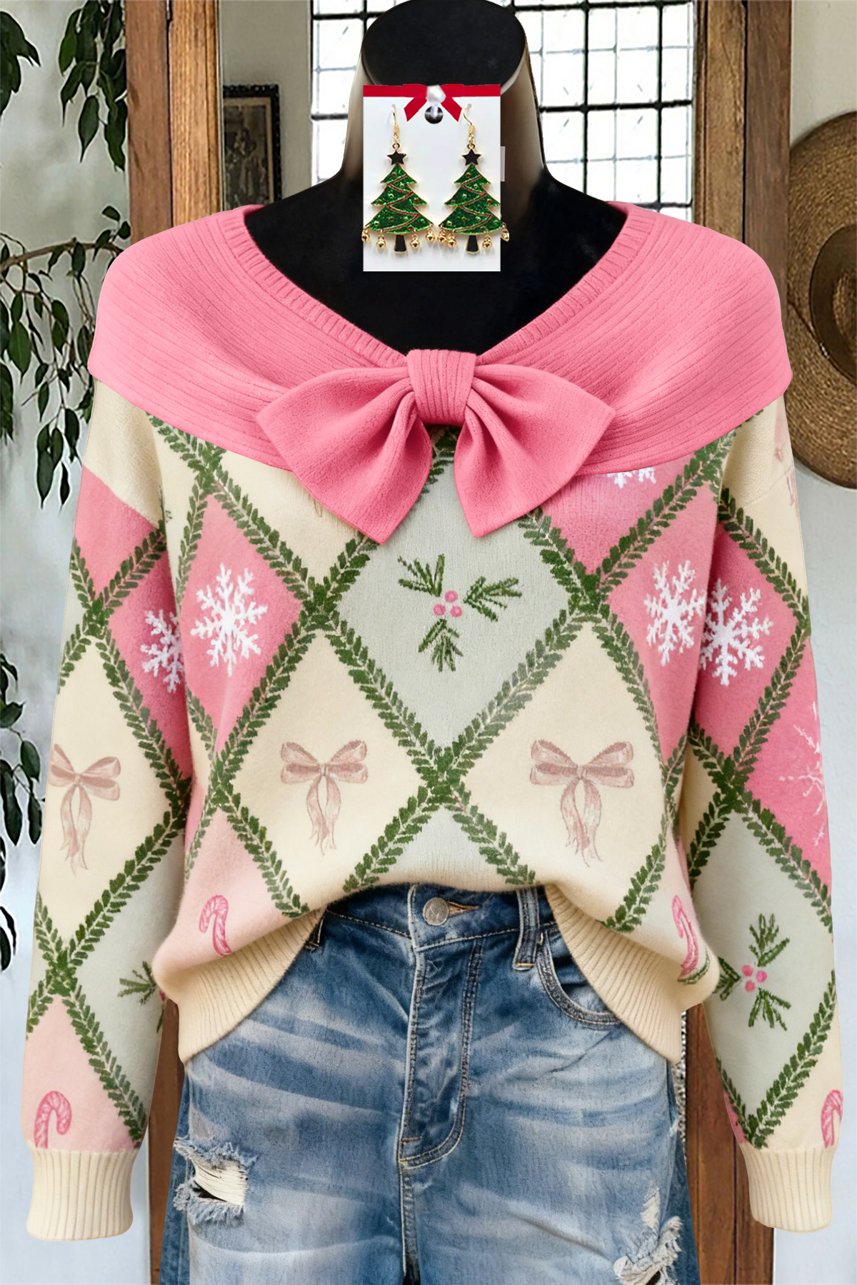 Sweet Christmas Diamond Holly Bow Sweater