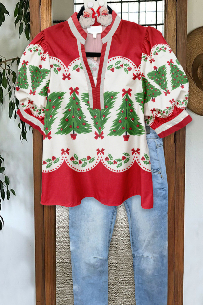 Christmas Tree Puff Sleeve Blouse