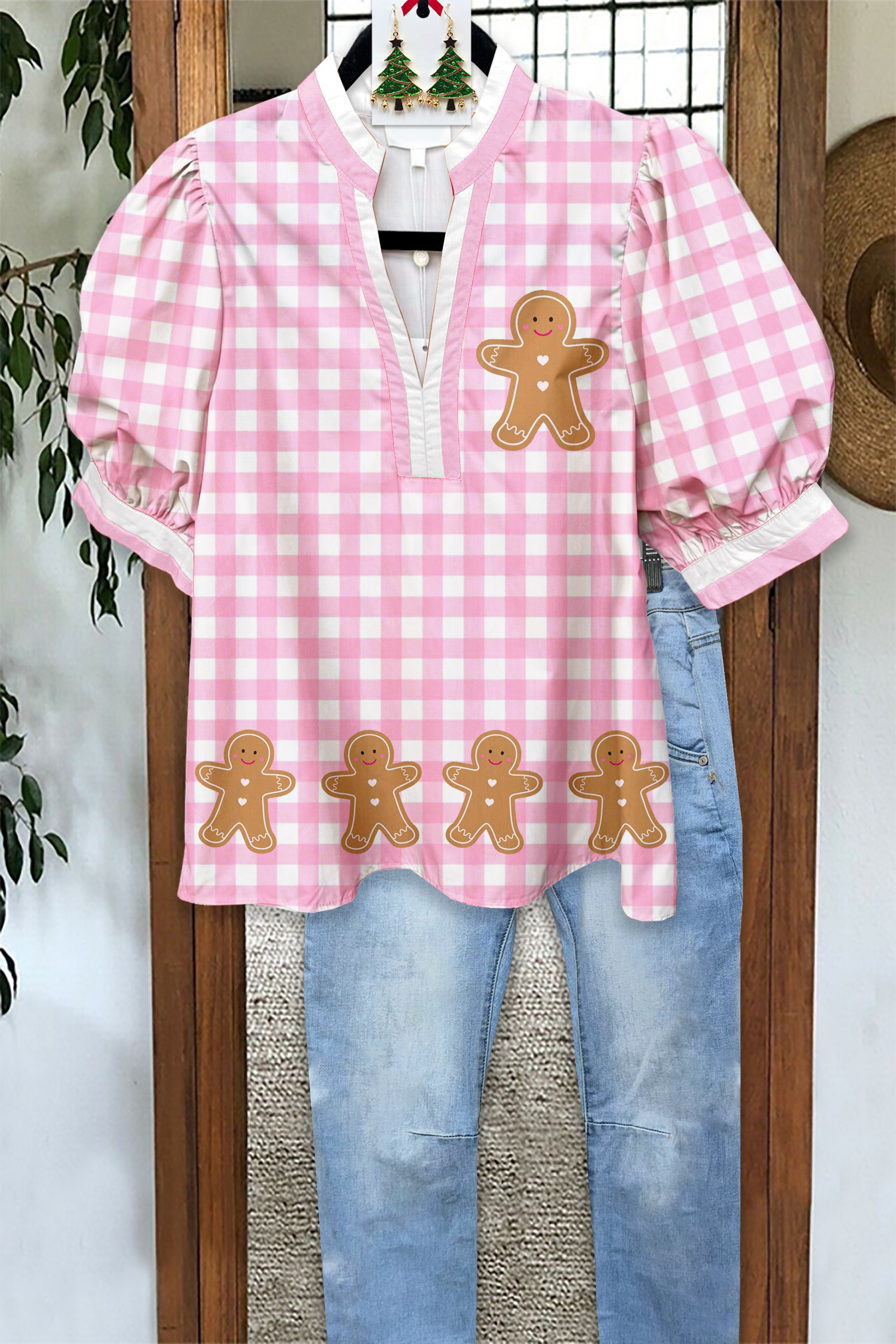Christmas Plaid Gingerbread Man Puff Sleeve Blouse