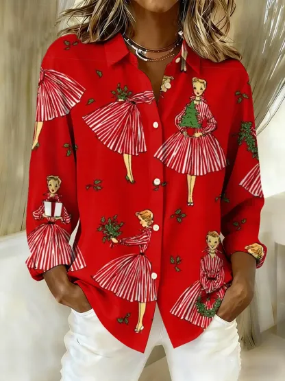Retro Christmas Art Cotton Long Sleeve Shirt