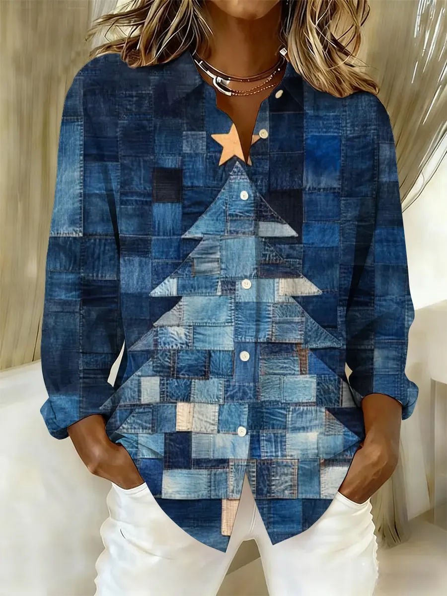 Retro Multicolor Christmas Patchwork Art Cotton Long Sleeve Shirt