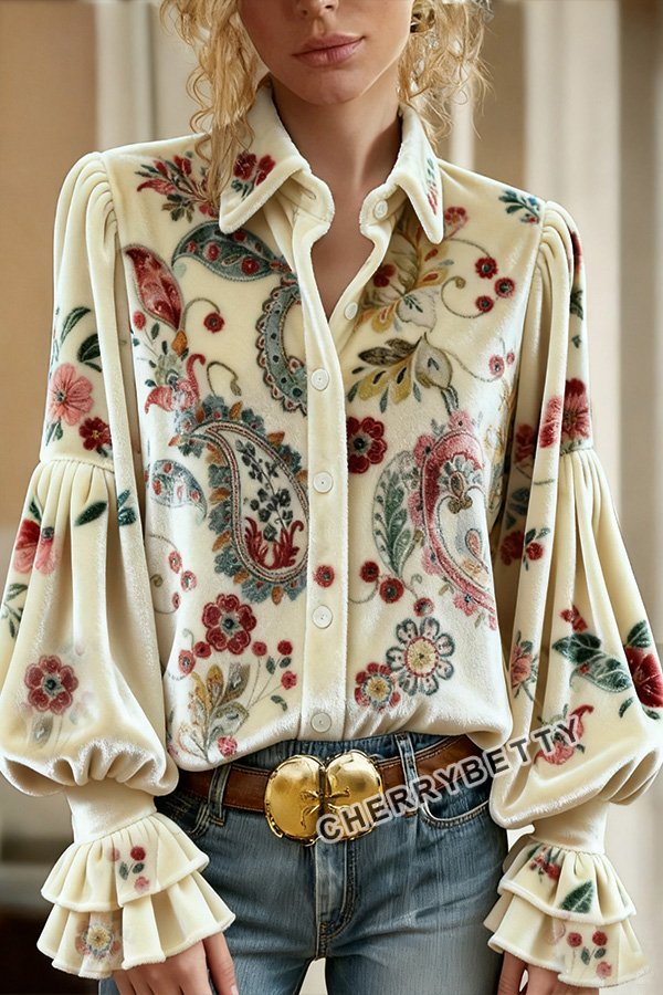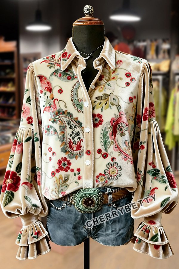 Retro Paisley Print Lantern Sleeve Velvet Top