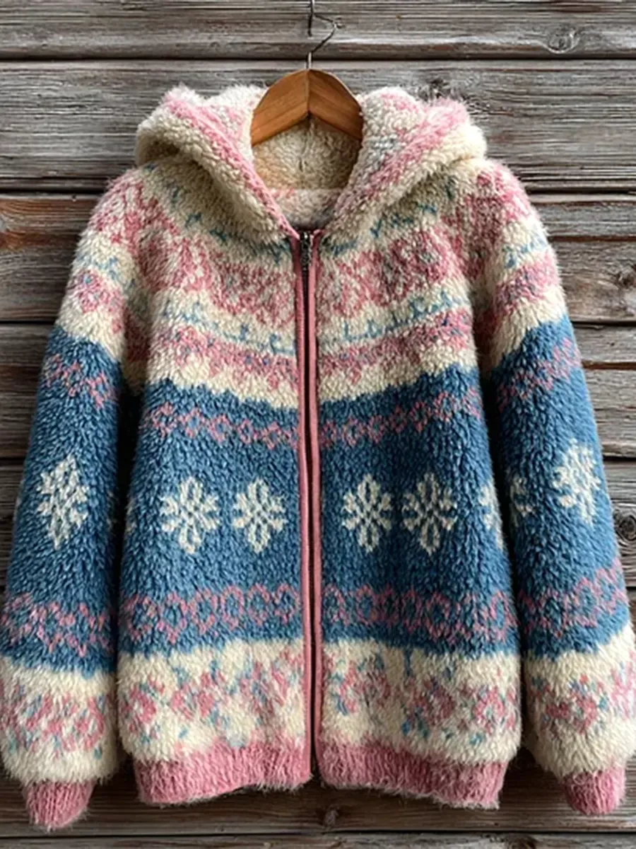 Retro Snowflake Art Print Casual Plush Hood Sweatshirt