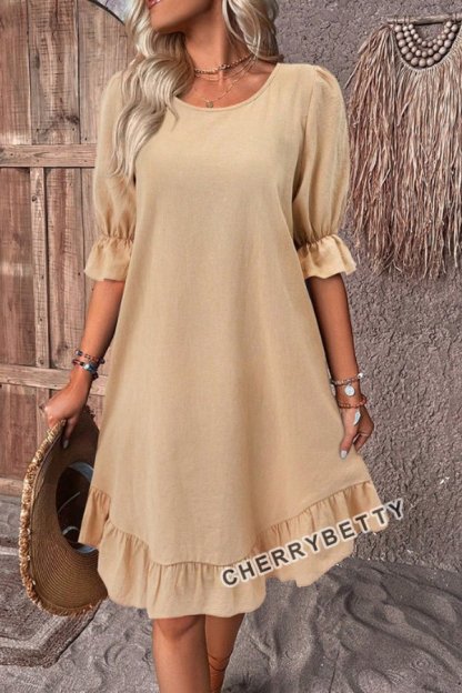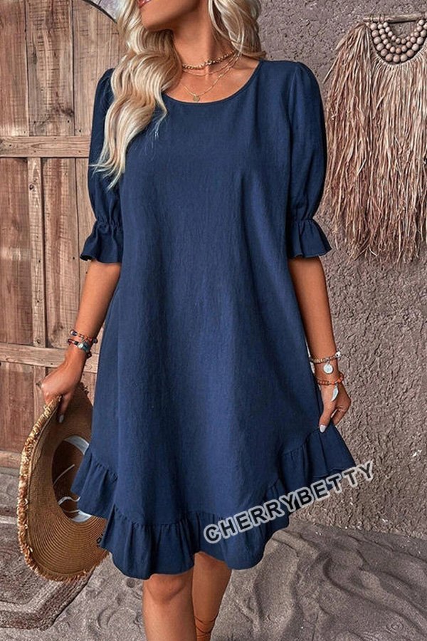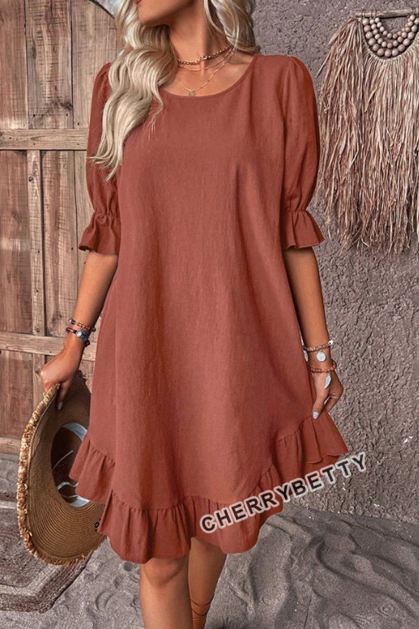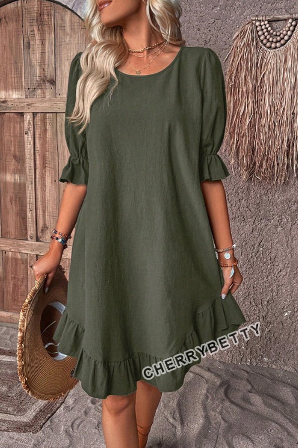 Solid Round Neck Ruffle Hem Linen Dress
