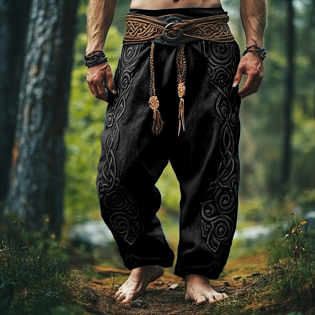 Tribal Viking Celtic Embroidery Art Linen Long Loose Wide-leg Pants