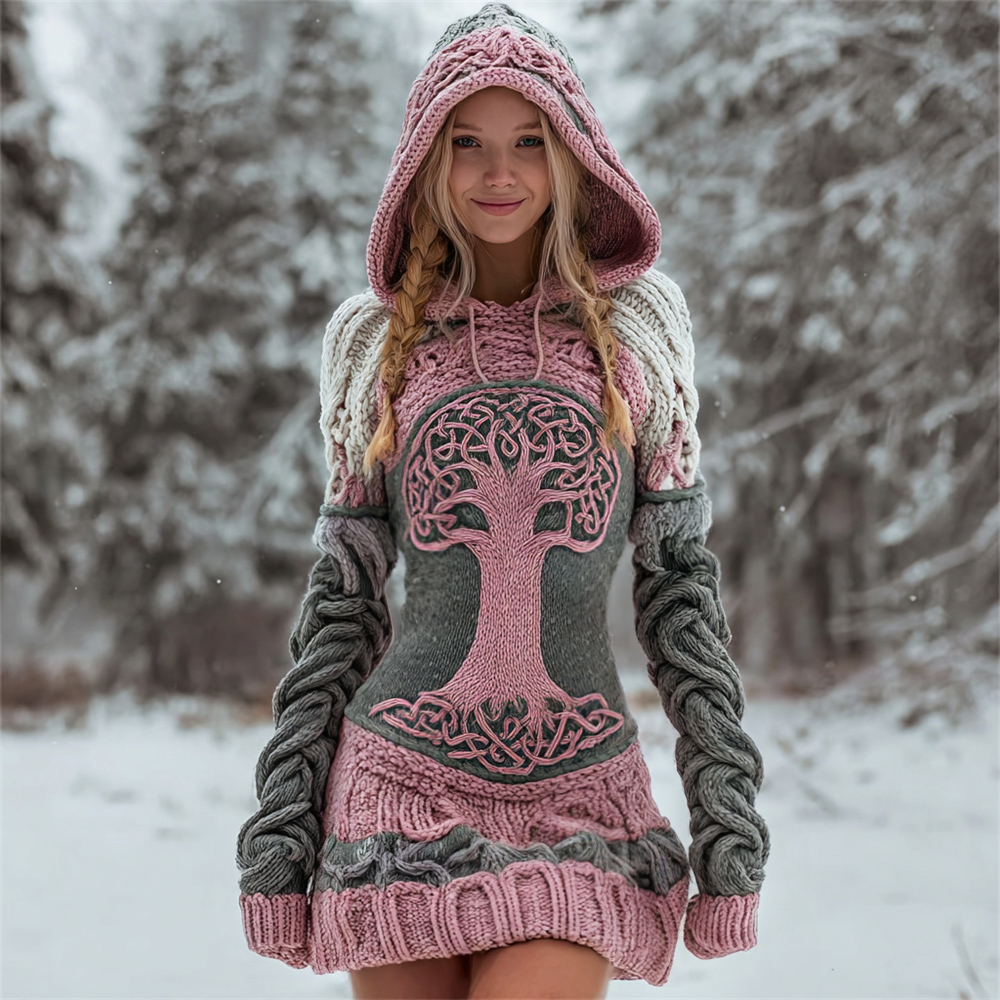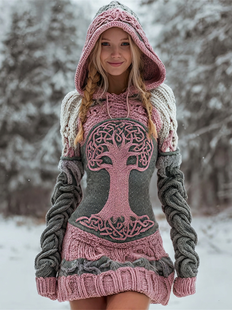 Viking World Tree Art Women's Knit Hooded Mini Dress