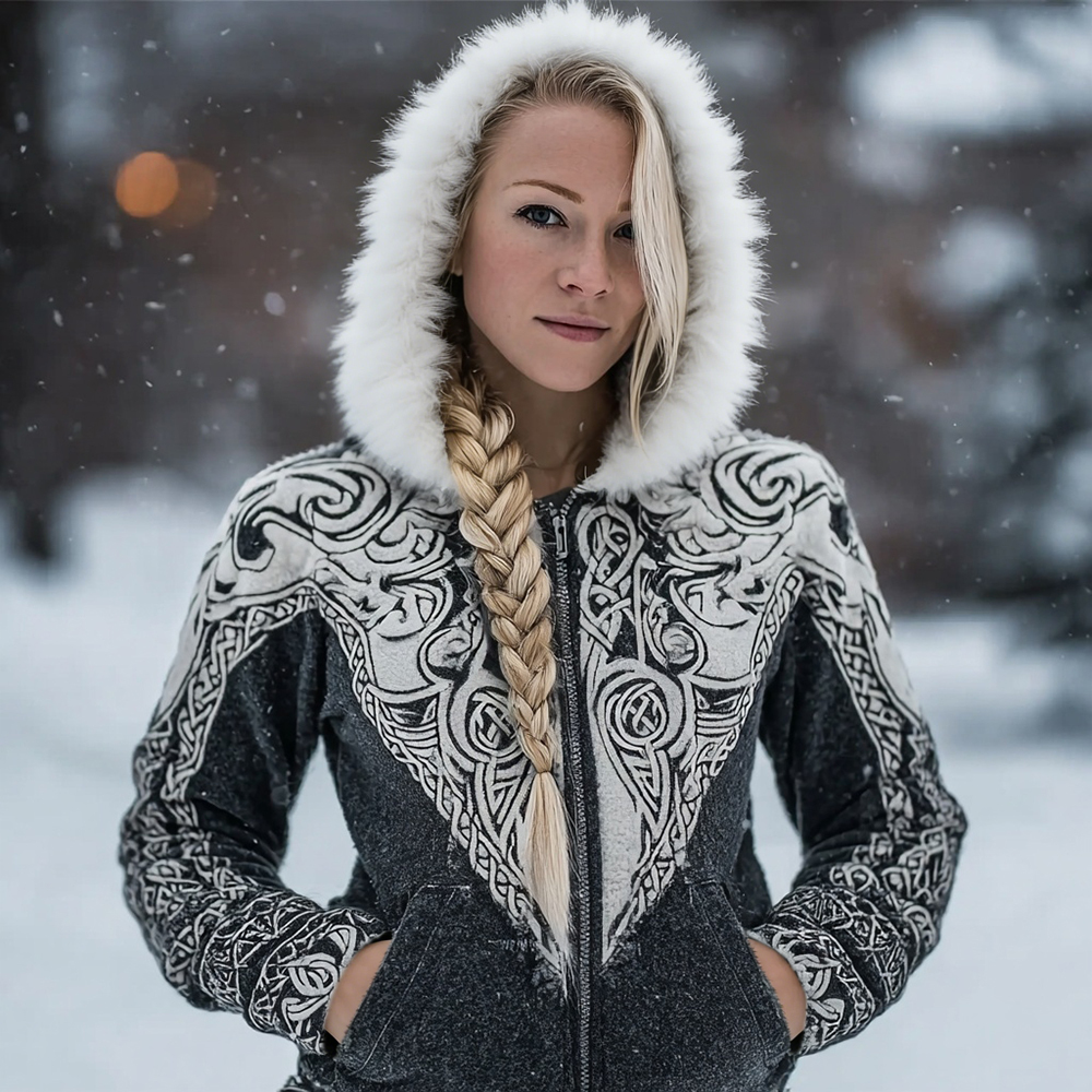 Vintage Celtic Knot Embroidered Fur Trim Full Zip Cozy Hoodie