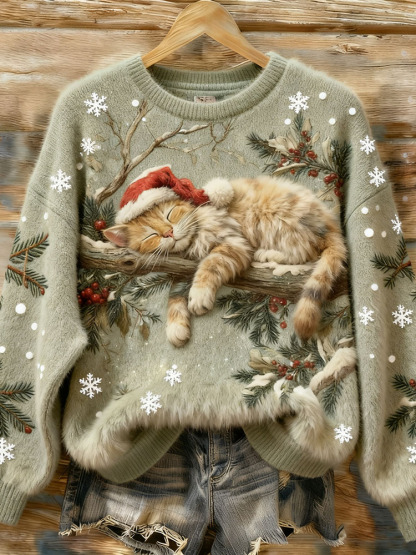 Vintage Christmas Lazy Cat Art Women's Cozy Plush Sweater