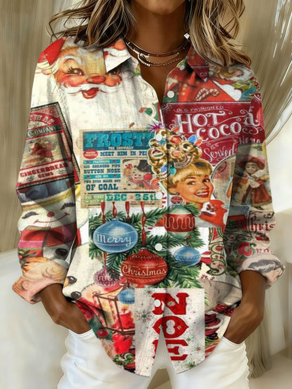 Vintage Christmas Santa Art Print Casual Cotton Shirt