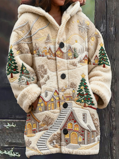 Vintage Christmas Snow Valley Embroidered Women's Knit Hooded Cardigan