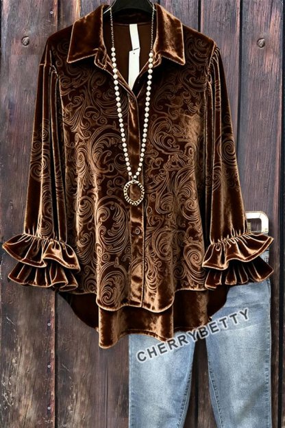 Vintage Floral Print Ruffle Long Sleeve Holiday Velvet Top